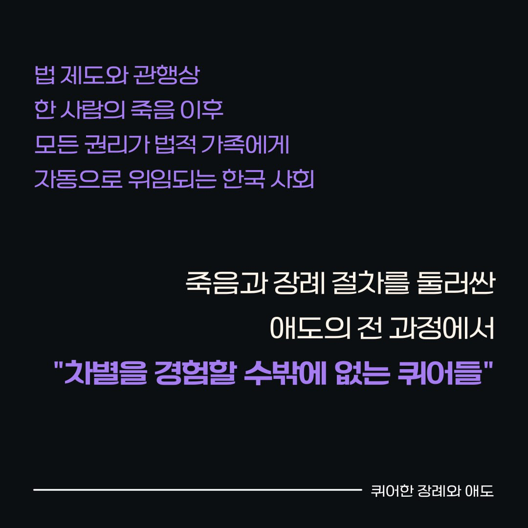 사회에서 공식적인 자격이 주어지는가는 곧 애도의 자격과도 연결되는데, 때문에 퀴어들은 장례 과정에서 애도의 주체가 되지 못한다. 생전 고인의 생존과 돌봄에 깊숙이 연루되어 있었던 네트워크 역시 충분한 위로와 지지를 받지 못한다. 결국 애도의 주체 또한 자신의 삶이 존엄하지 않다는 사회적인 위치를 확인하게 된다.