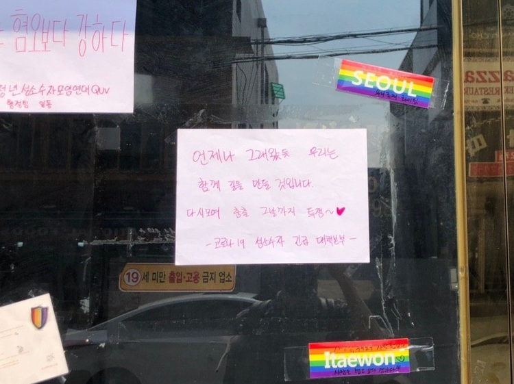 ▲ 2020년 이태원 클럽 발 집단감염 당시 해당 클럽 앞. 성소수자 혐오와 차별에 지지 말자는 다짐과 응원의 메시지들이 붙어있다. (사진제공: 코로나 19 성소수자 긴급 대책본부)